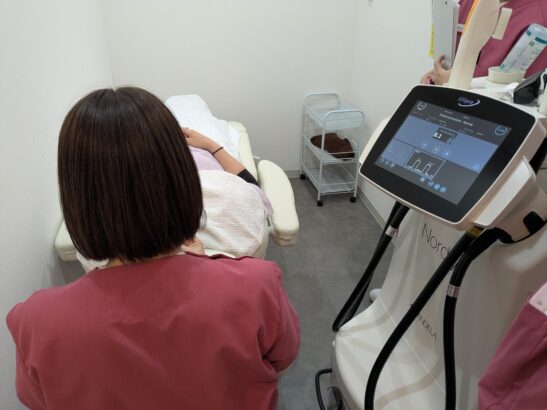フォトフェイシャルは機械を使った施術の中では痛みは少ない方ですが、ゴムではじかれたような痛みがあります。「ちょっと痛い」くらいがちょうどいいので、その値をテスト照射で確かめてから顔全体に施術します。黒い色素に反応するので、日焼け直後は避けてください。また、塗布後に紫外線カットする必要がある美容液(トレチノイン軟膏、ハイドロキノン軟膏)は施術の2,3日前から中止してください。